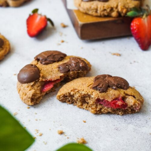 Per questi biscotti avena fragole e ovetti ho utilizzato fragole biologiche italiane, ovetti di cioccolato vegan e farina di avena locale.
